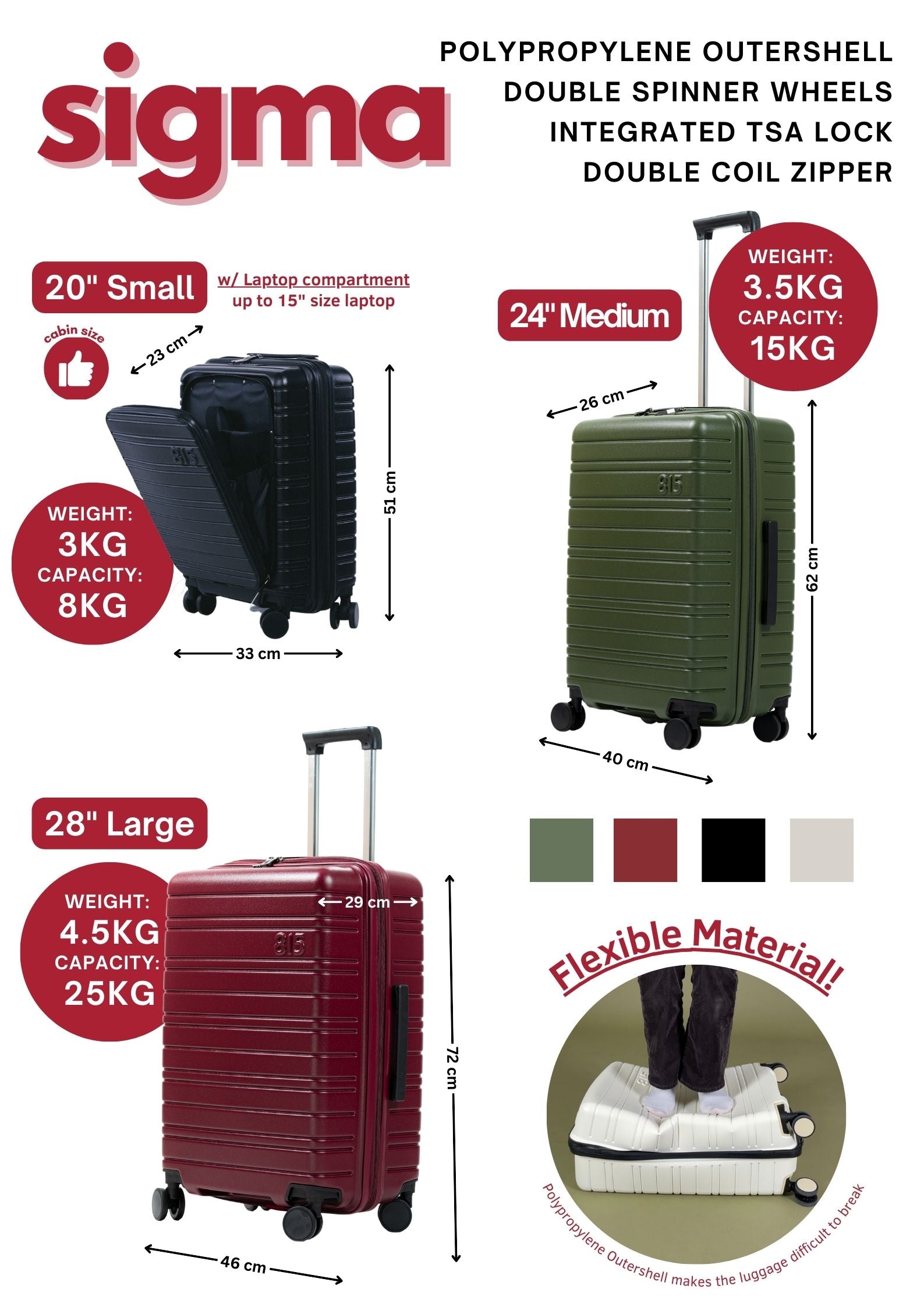 | Sigma Check In | 40*26*62 cm | 3.5 kg | 15 kg |